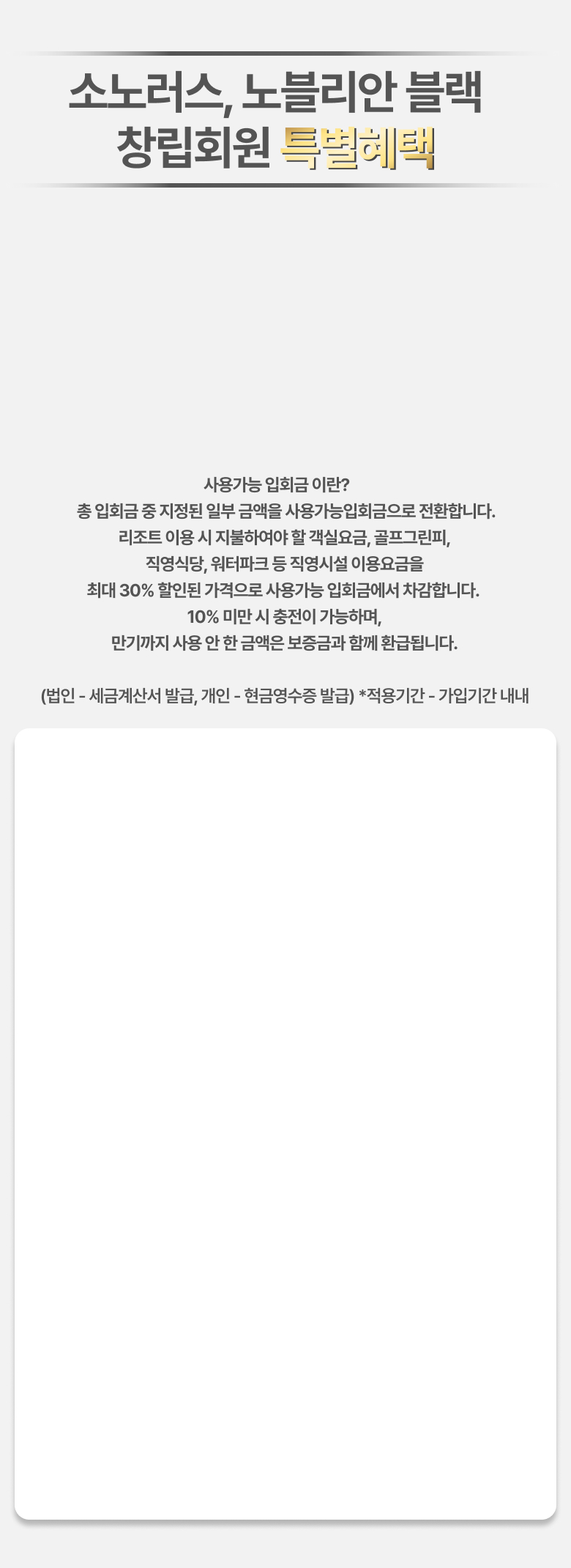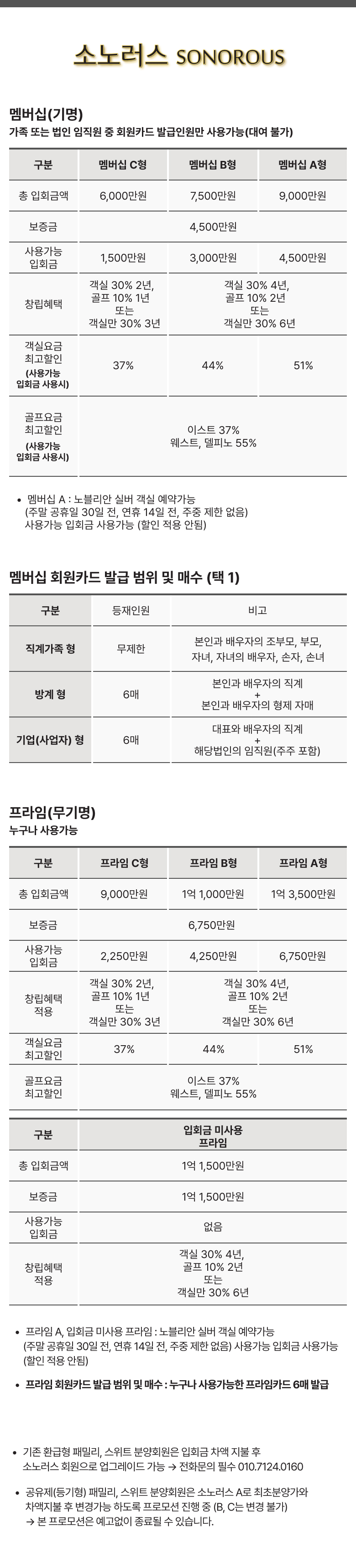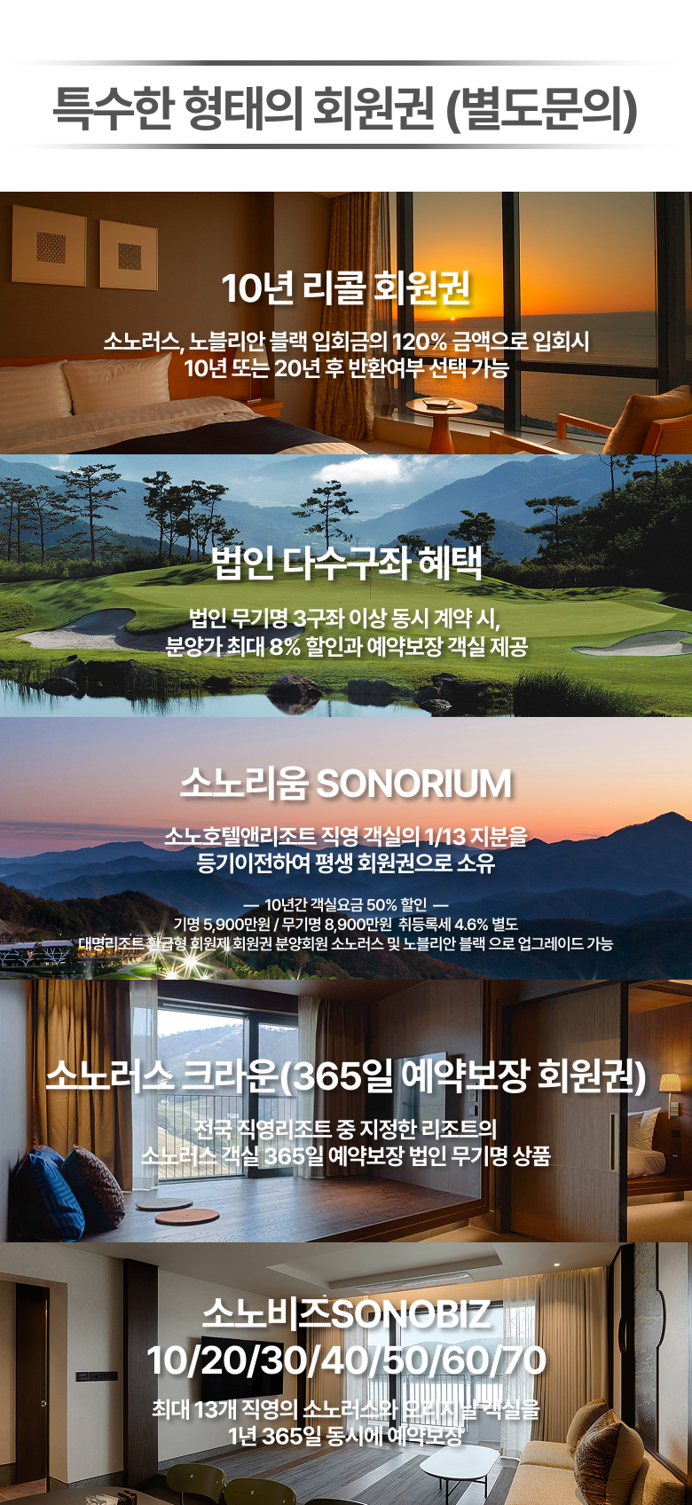 sonorium17 소노리움 17 신규 한정판 선착순 500구좌 한정 판매 기명 무기명 동일 특별가 동일 특별가 51,000,000원 3~4구좌 5구좌 일시불 계약시 48,500,000원 47,000,000원 혜택은 그대로 비용 부담은 줄여 합리적으로 한정 판매 멤버십 소노리움17 기명 소노리움17 무기명 객실혜택형 종합혜택형 골프혜택형 법인 공유제 회원권 소노리움 17 입회 금액 소노리움 17 가입 혜택 입회 금액 가입 혜택